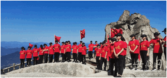 據(jù)了解,天柱山風(fēng)景區(qū)當(dāng)天舉行了“立天柱之巔·燃愛國之情”活動(dòng)。此次活動(dòng)由天柱山風(fēng)景區(qū)組織,潛山各行各業(yè)共72名青年參加,統(tǒng)一佩戴黨徽,身穿“我愛你中國”紅色T恤,佩戴“我愛你中國”紅色口罩,佇立在天柱山第二高峰1426米的天池峰之巔,手握紅旗,告白祖國,歌唱祖國,齊祝祖國繁榮昌盛,國泰民安。