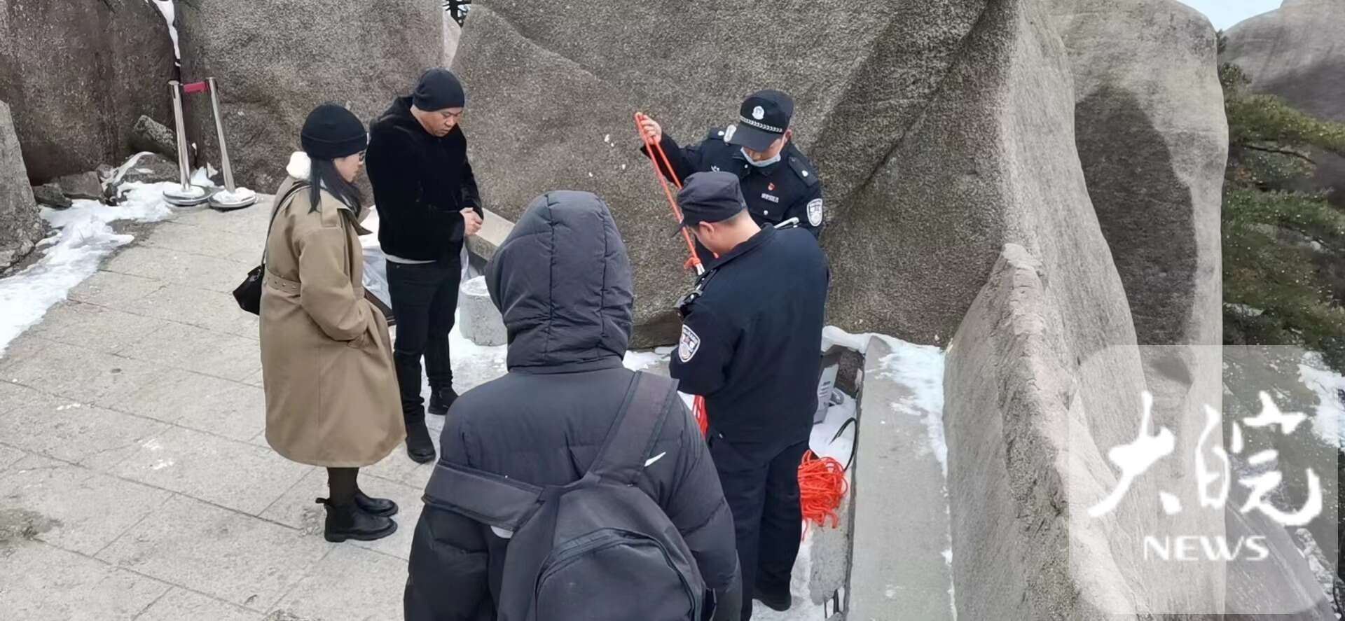 天柱山景區(qū)執(zhí)法大隊主峰景區(qū)中隊隊員葛臣第一時間趕往現場。經查看,發(fā)現懸崖陡峭,高達10米,加上那段時間正值大雪天氣,懸崖結冰打滑,無法施救。吳女士又撥打110尋求幫助。接報后,茶莊派出所兩名輔警到達現場,仍無法施救。經商議,吳英同意放棄施救,下山回到嘉興。
