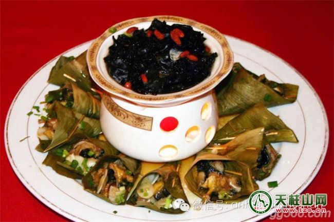 特色: 石耳燉老鱉 特點(diǎn):湯清、味鮮香、鱉酥爛,具有清涼驅(qū)火之功效。天柱農(nóng)家臘肉 農(nóng)家臘味——柴火蒸臘肉(當(dāng)?shù)剞r(nóng)人自養(yǎng)的黑公豬肉)